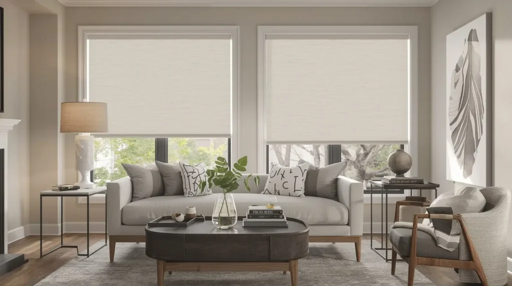 Living rooms often need flexible light control. Many people choose layered shades with drapes, roman shades, or modern blinds. These options help reduce glare on screens while keeping the room bright.